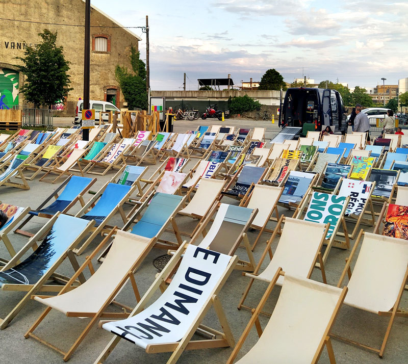 L’entreprise à but d’emploi AcSoMur a conçu 100 chiliennes en bois de palettes et en bâches publicitaires récupérées localement pour un collectif culturel proposant des séances de cinéma en plein air.