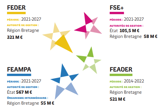En France, une partie des fonds Européens est confiée aux régions pour mieux répondre aux enjeux spécifiques des territoires. Les enveloppes allouées à la Bretagne sont gérées majoritairement par le Conseil Régional de Bretagne (CRB), en partenariat avec l’État. Près de 40.000 projets ont été soutenus depuis 2014. Pour la période 2021-2027, la Bretagne bénéficiera à nouveau de 4 fonds européens :
