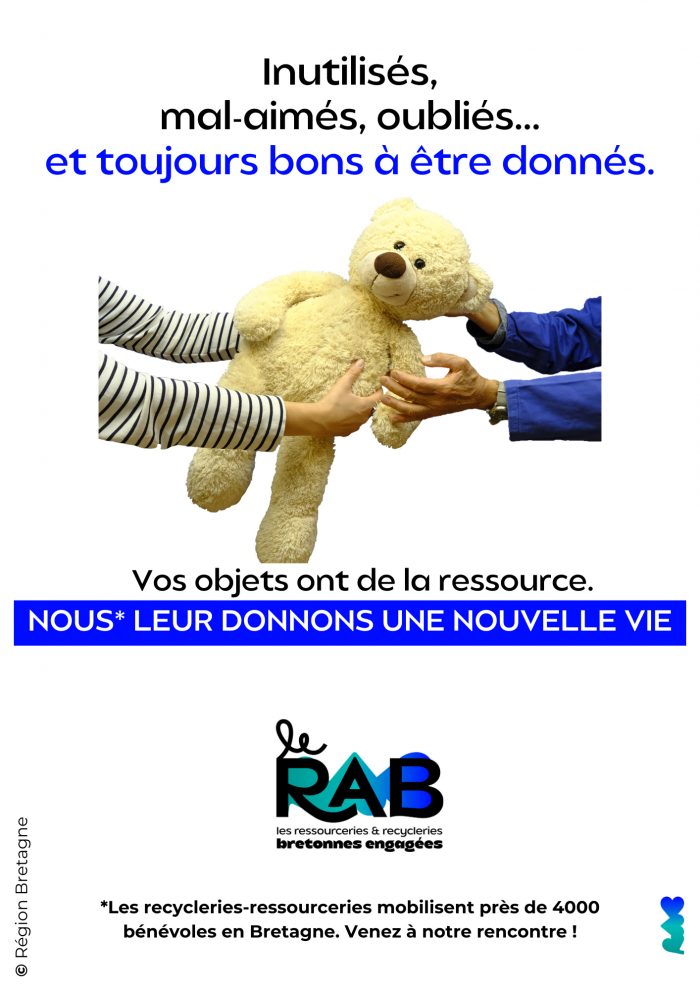 L’objectif ? Sensibiliser le grand public, les professionnels et les collectivités à la réduction de leur déchets : vieux jouets, appareils électriques défectueux, vêtements, mobilier… Cette campagne vise donc à inciter les consommateurs à réparer leurs objets plutôt qu’à les jeter. Elle encourage aussi les Bretons à se tourner vers la seconde main, grâce aux ressourceries et aux commerces spécialisés : un visuel de la campagne a été spécialement créé avec le Rab, le réseau des recycleries et ressourceries bretonnes engagées, qui venait tout juste d'être lancé !