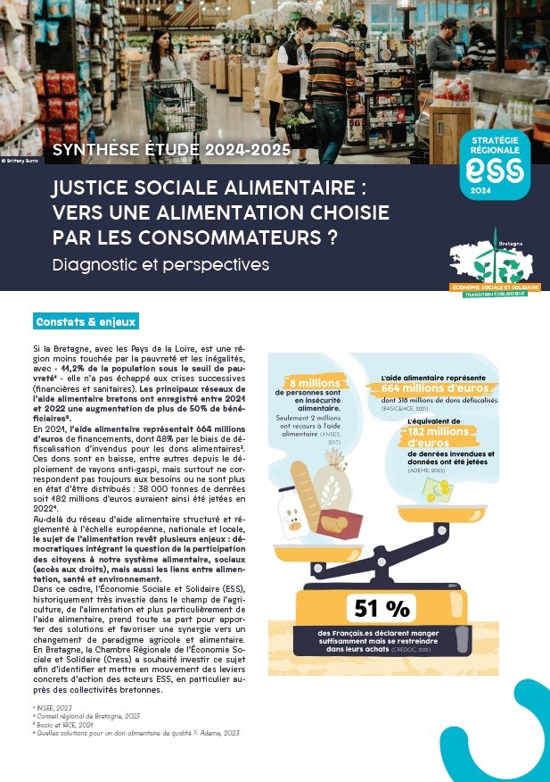 En 2024, la Cress Bretagne a mandaté l’Institut Agro Rennes-Angers pour réaliser une étude autour des enjeux de justice sociale alimentaire. Avec l’appui de Marilyne Huchet, professeur en économie, 5 étudiantes du parcours Ingénieur Agronome spécialisation Agréconomie et Politiques publiques et du master E2AME ont ainsi réalisé ce travail, également soutenu par le pôle alimentation (Sylvie Thoby). Les objectifs de cette étude sont les suivant :