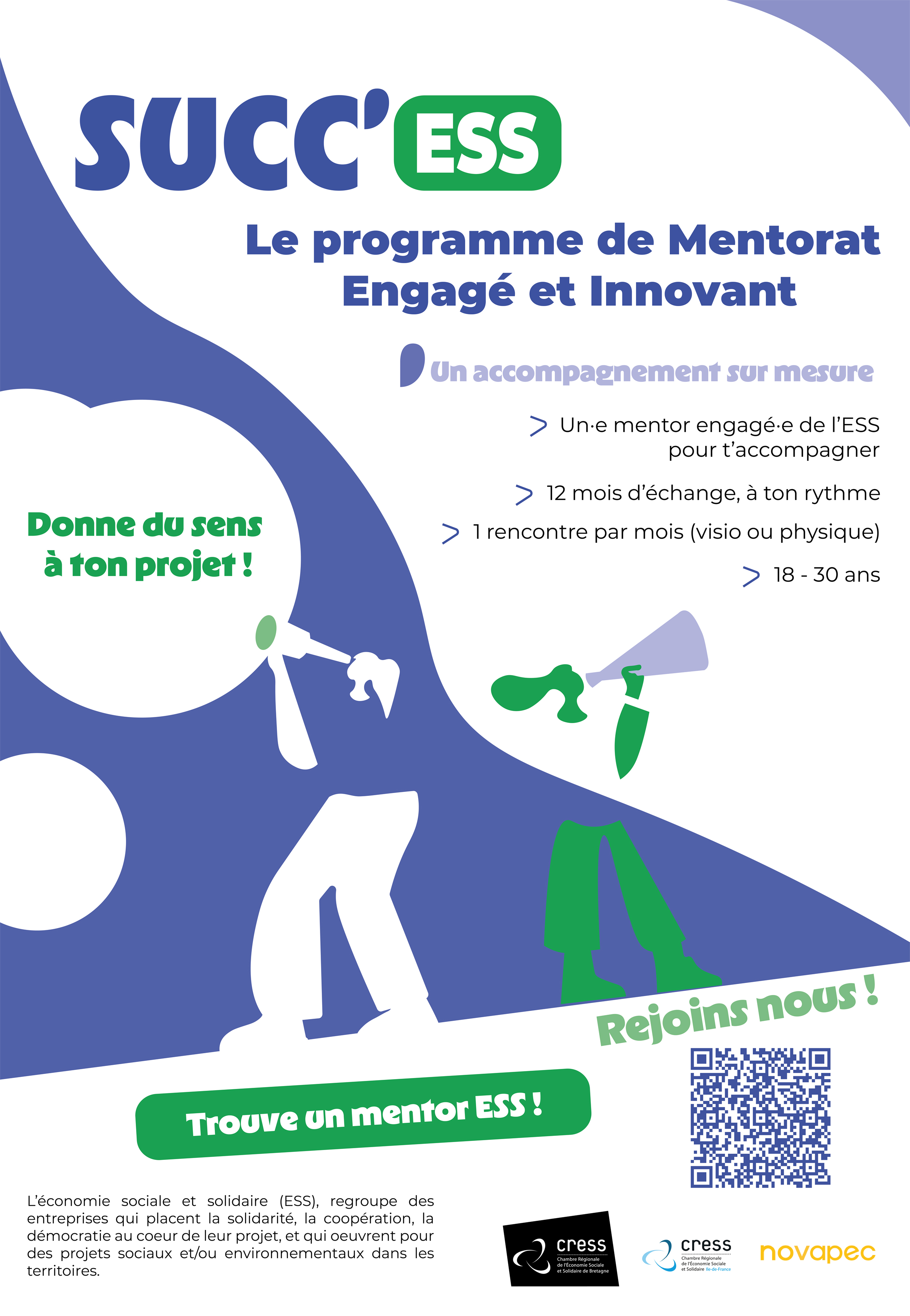 - Un suivi personnalisé avec un·e mentor·e engagé·e dans l’ESS pour t’accompagner
