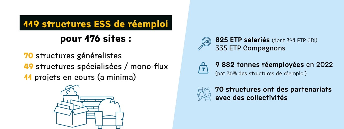 Malgré les conséquences de la crise sanitaire (fermeture des locaux et suspension des activités, chiffres d’affaires et modèles économiques impactés, afflux des apports post-déconfinement…), les activités de réemploi solidaire sont en plein développement : le nombre de structures a ainsi augmenté de 33 % entre 2018 et 2021 puis de 18 % entre 2021 et 2023. Aujourd’hui, il existe ainsi pas moins de 119 structures ESS de réemploi pour 176 sites différents. 11 projets en émergence ont également été recensés (le nombre réel étant vraisemblablement plus élevé).